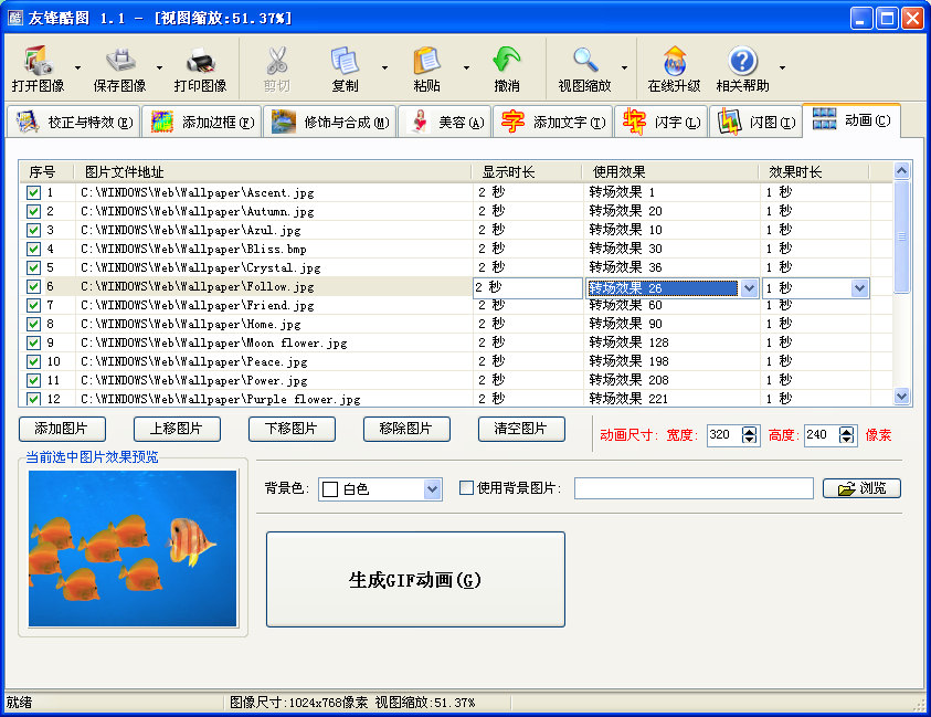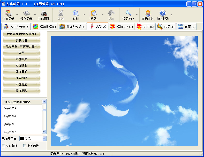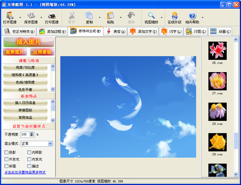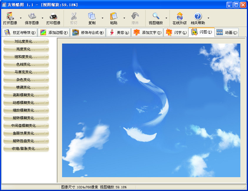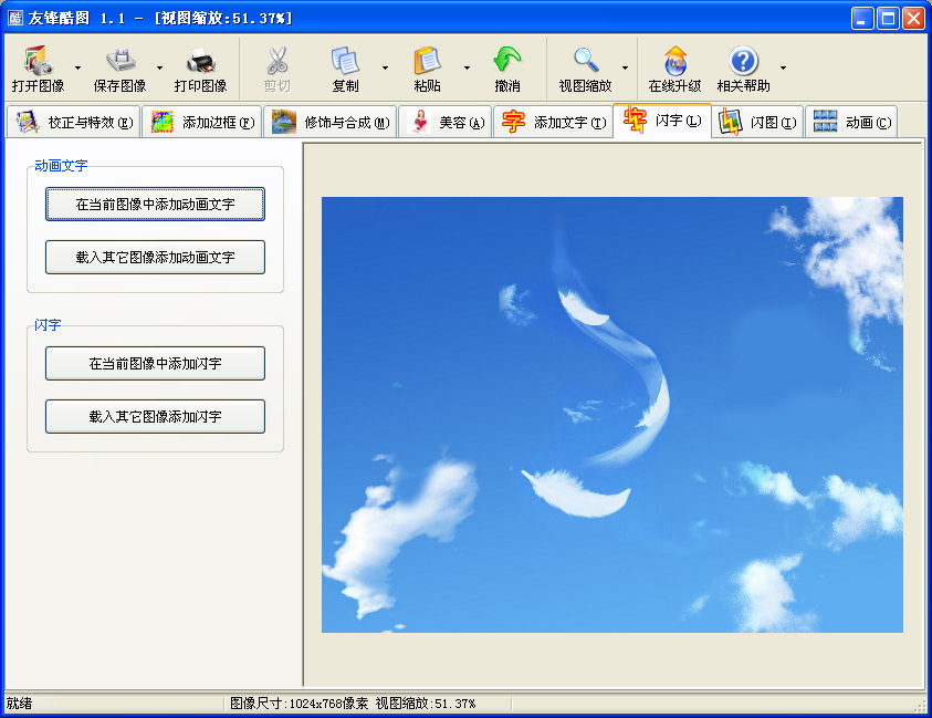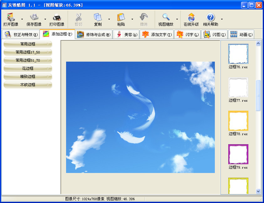 友锋酷图是一款非常简便易用的图像处理软件,您可以用它对图像进行高质量缩放、打印。可以对图像进行自由裁剪,不仅可以进行传统的矩形裁剪,还可以进行圆形、圆角矩形或任意形状的裁剪。友锋酷图提供了大量的图像特效,您可以很方便的用它对图像进行各种特效处理。同时您可以很方便的为图像添加各种相框、文字,并且带有大量文字特效,方便您在图像中插入特效字、艺术字。友锋酷图支持图层及图层样式,您可以非常方便的用它进行图像合成、抠图、换背景等。并可以非常方便的给人物照片进行美容处理。友锋酷图提供了闪字及闪图制作功能,可以很方便的为图像添加动态文字、闪字,将图像制作成闪图等GIF动画。