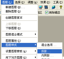 4、单击右键,从右键菜单中选择“取消选择”,然后点击菜单栏“图层”——“图层样式”——“投影”。