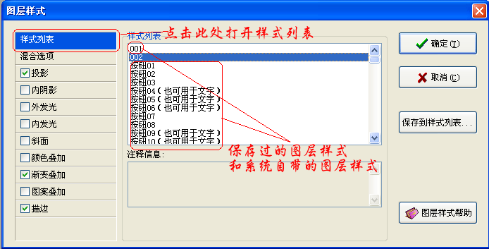 如查用户感觉这个图层样式以后还需要使用,那就可以将其保存,点击“保存到样式列表”,会弹出一窗口,给图层样式命名后,打开样式列表,就可以看到,我们保存的图层样式了。