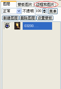 启动《友锋图像处理系统》后,打开一幅图像,在窗口的右下角看到一个“图层”“蒙板图片”“边框与图片”窗口,点击“边框和图片”在这里你会看到边框列表,这里的边框是保存在《友锋图像处理系统》安装文件夹下的“Frame”文件夹下的边框。