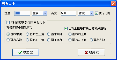 素(每个边都加长25总共就是50像素),在调整画布大小的同时要将后面“锁定比例”去除(否则系统会根据原画布大小的宽、高比自动设置具体的值),去掉“让背景图层扩展出的部分透明”,同时选中“同时调整背景图层画布大小”,将背景图层中图像定位为“画布中央”(默认状态下是“画布中央”)