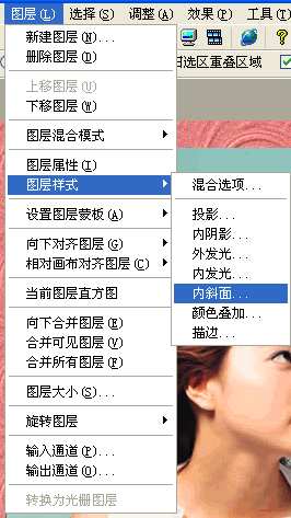 点击菜单栏“图层”——“图层样式”——“内斜面”。