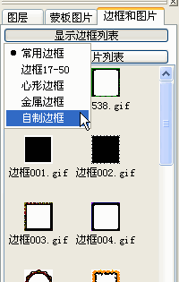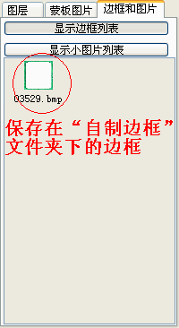 单击确定以后,在回到右下角的图层窗口中,点击“边框和图片”,再点击“显示边框列表”会弹出一菜单,选择“自制边框”,会看到在边框列表中显示刚才保存的边框文件。