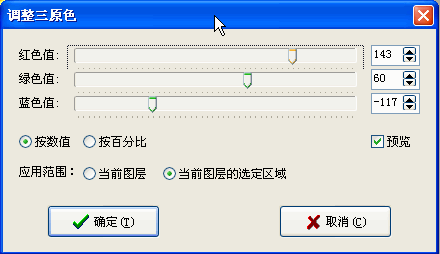 4、调整三原色,给鸡上色。点击菜单栏“调整”——“三原色”,调整三原色各个的值。
