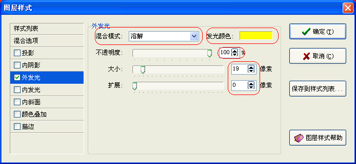 6、将作好的“春”字和准备好的“鞭炮”素材(抠取“鞭炮”)导入到该图像中,并设置“鞭炮”层的图层样式为外发光(注意:将外发光混合模式设置为“溶解”)。