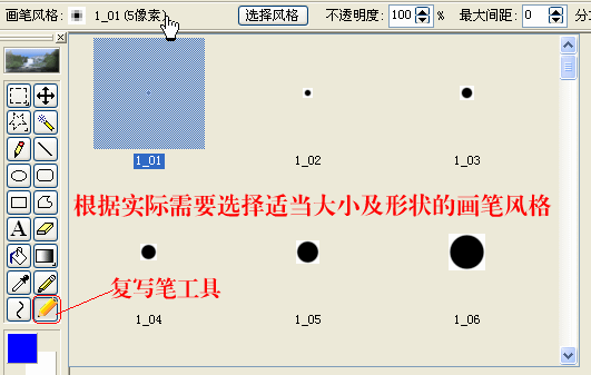 复写笔的使用方法:首先在“绘图工具选项区”选择好要使用的画笔风格(此图中文字边较细小,因此应用较细小的画笔风格),然后在图像中按住Alt键的同时点击鼠标左键定位要开始复制的图层及图层中的位置(默认为背景层的0,0坐标处)。然后在要复写到的图层中的相应位置开始绘制即可。