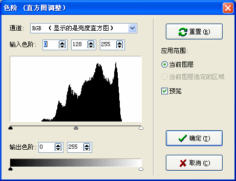 从直方图中,我们可以看出,这幅图像的像素大都集中在直方图的中间,左边及右边几乎为空白,说明图像对比度较低,我们可以使用鼠标拖动直方图中最左边的黑色滑块 及最右边的白色滑块到像素比较集中的区域来增加图像对比度: