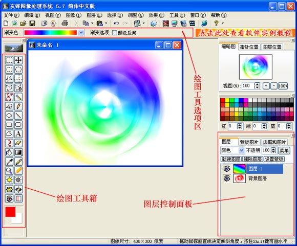 在“缩略图”窗口下面的颜色框中点击鼠标可以定义绘图工具箱中的前景色,很多绘图工具都是根据前景色作为颜色进行绘图的。