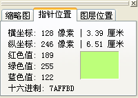 在“缩略图”面板中的“指针位置”面板可以查看鼠标指针处的颜色信息及指针坐标等信息:
