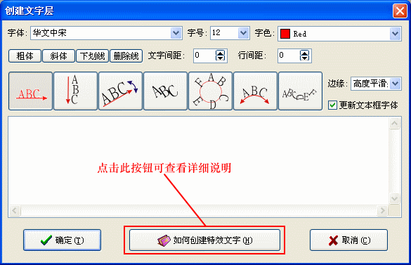 您可以通过很多方法制作艺术字,最方便最常用的就是通过“图层样式”制作,在很多实例教程中都有相关的介绍,比如在实例教程“制作带日历信息的桌面壁纸”及“制作带心形背景的情人贺卡”中都提到了如何制作特效字。另外在软件中插入文字时,在弹出的“创建文字层”窗口中,点击窗口底部中间那个“如何创建环绕字、变形字”按钮,也可以看到一些相关的说明。