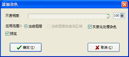 在“添加杂色”窗口中将“不透明度”设置为“100”,并选中“灰度化处理杂色”选项。然后按下“确定”,会得到一幅充满杂色的图像(教程中显示的是缩小后的图像):