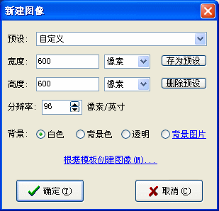 在“新建图像”窗口中将“宽度”、“高度”分别都设置为600(当然您可以根据自己的需要设置宽度和高度),并将“背景”设置为“白色”,然后按下“确定”便建立了一幅600 X 600像素大小的新图像。