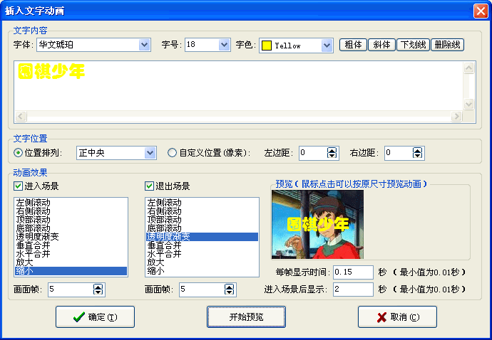 输入文字内容,并设置好文字字体、字号、字色等,设置好文字位置并选择好进入场景及退出场景的动画效果、设置好画面帧数量及显示时间等后,按下“确定”即可插入文字动画。