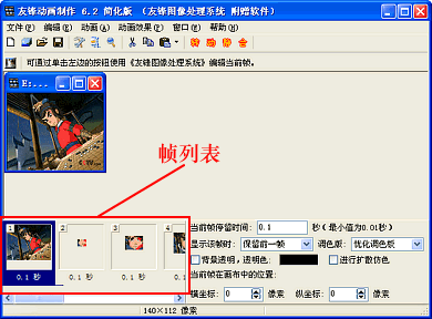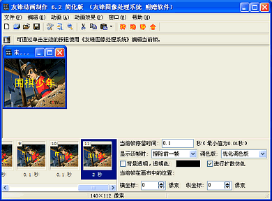 方法的原理很简单,即:使用友锋图像处理系统将组成GIF动画的各个帧一幅一幅的人工绘制、制作出来,然后使用友锋动画制作简化版连接成GIF动画即可。