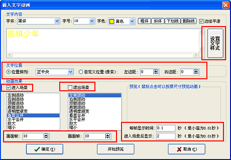在弹出的“插入文字动画”窗口中(注意图中用红框标出的设置内容):