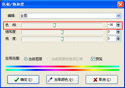 将“色相”调整为:“-36”,然后按下“确定”。