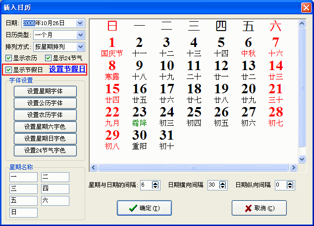 3、插入日历功能增加节假日选项(菜单:“工具”——“插入日历”),可以在日历中显示节假日信息并可以自由添加或删除节假日。
