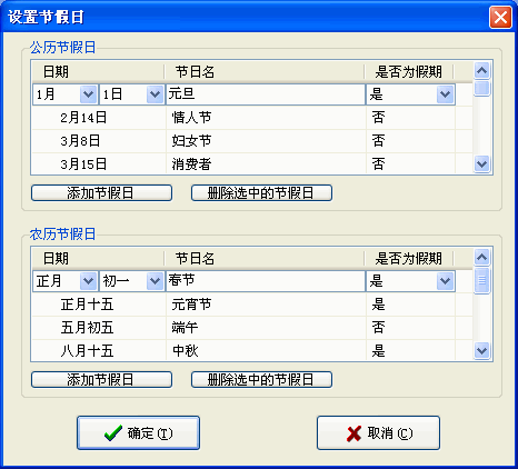 点击“设置节假日”可以弹出设置节假日窗口,自由添加或删除节假日: