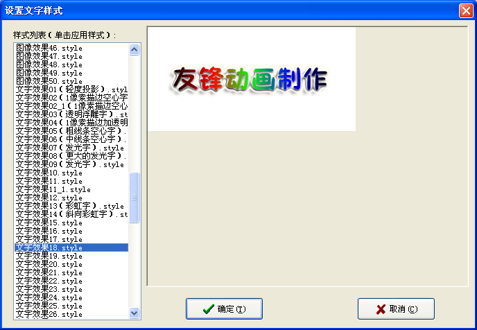 7、《友锋动画制作 简化版》“插入文字动画”(菜单:“动画效果”——“插入文字动画”)命令,增加“设置文字样式”命令,可以为动画文字添加样式效果,以便于制作特效文字动画