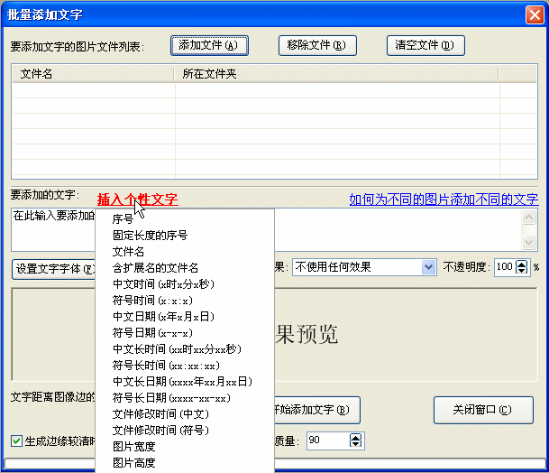 您可以使用一些关键字为不同的图片添加不同的文字,您可以点击“插入个性文字”插入一些关键字,这些关键字,软件会自动根据相应图片的情况自动生成为图像添加的文字。