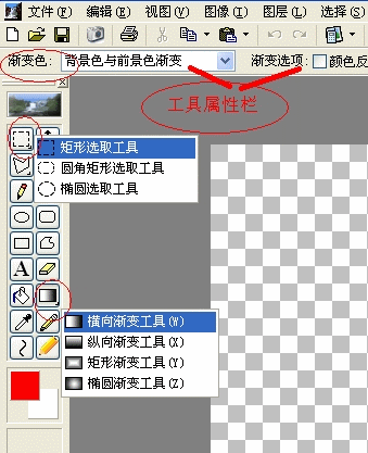 2、到绘图工具栏中选择“正方形选取工具” 在文档区域画一个矩形,再次选择“横向渐变工具”并到工具属性栏中编辑我们需要的渐变色,并对选区用渐变色进行填充。